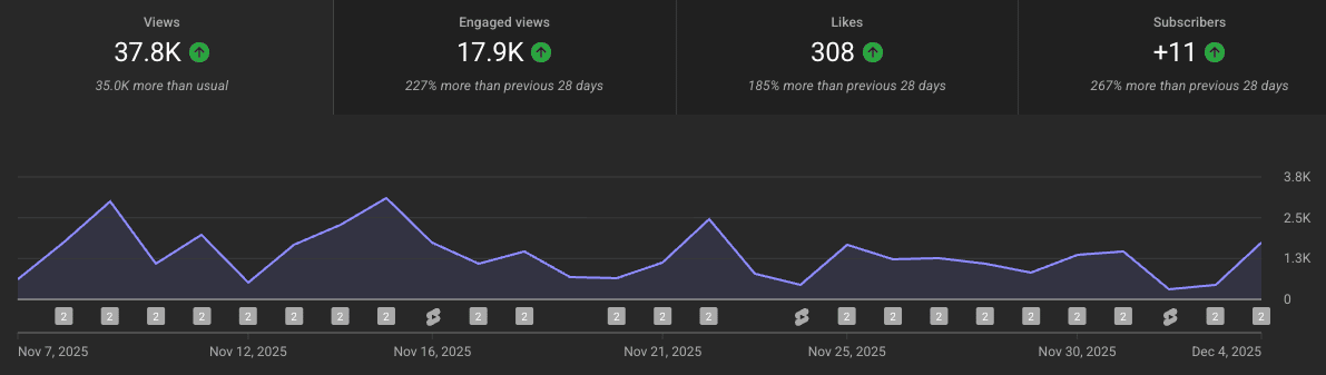 Here’s the uncomfortable truth: I’ve been creating video for years: Podcast appearances, conference keynotes, content houses, brand collabs. All of it sitting in Google Drive, collecting dust. I’d post a clip once on LinkedIn, maybe twice if it did well — and then move on. Yes, typing this makes me guilty of the 4th Marketing Commandment: Thou shalt repurpose thine content. Forgive me, Lord, for I have sinned. But here’s what actually pushed me over the edge: Momentum compounds faster on video than anywhere else. Colin (my YouTube strategist) explained it simply: “When you stop posting and start again, the algorithm doesn’t hate you. It just needs data to understand what your content is and who to show it to.” I’d been starting from zero every single time. But nt anymore. In 30 days, we went from ~1,000 to 37,800 views on Shorts.