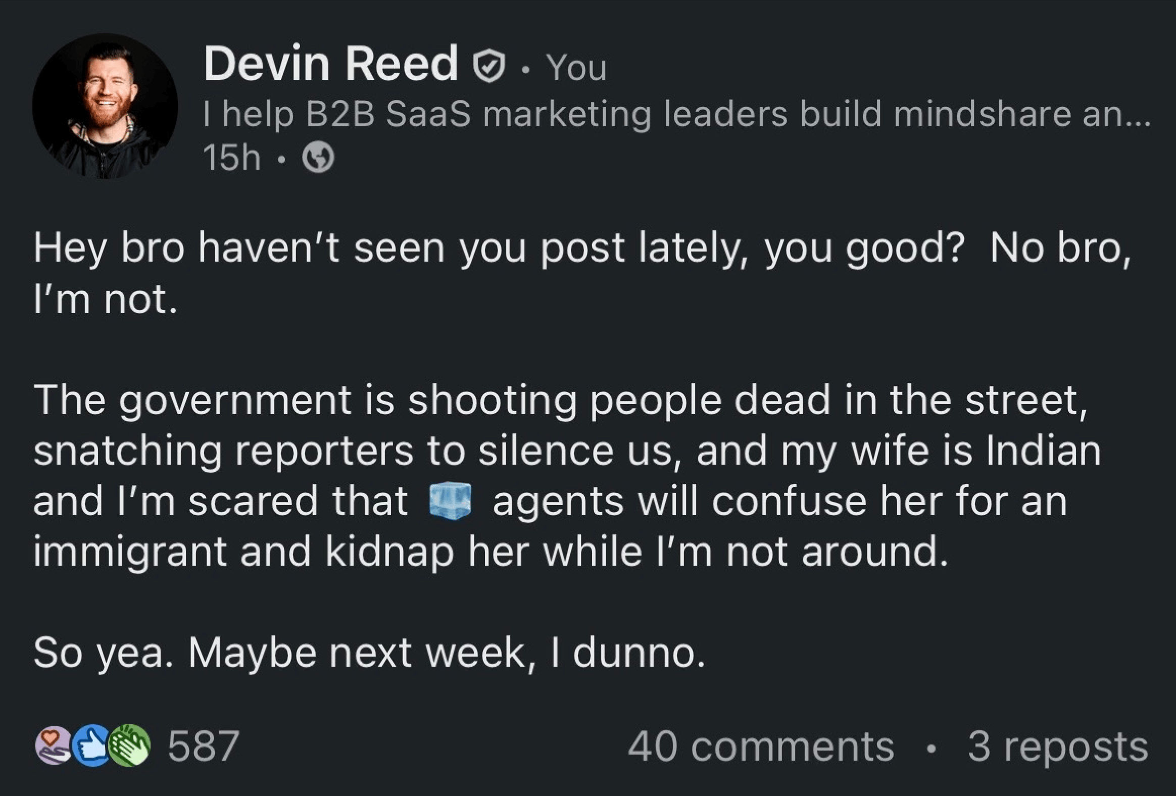 Political unrest, personal fear, maybe a broader moment that makes “posting as usual” feel off.